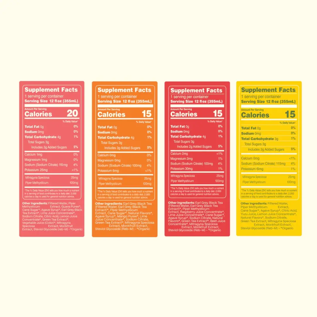 - Yuzu: Brewed Oolong Tea, Organic Cane Sugar, Agave Syrup, Yuzu Juice, Natural Flavors, Monkfruit Extract, Stevia (Reb-M).